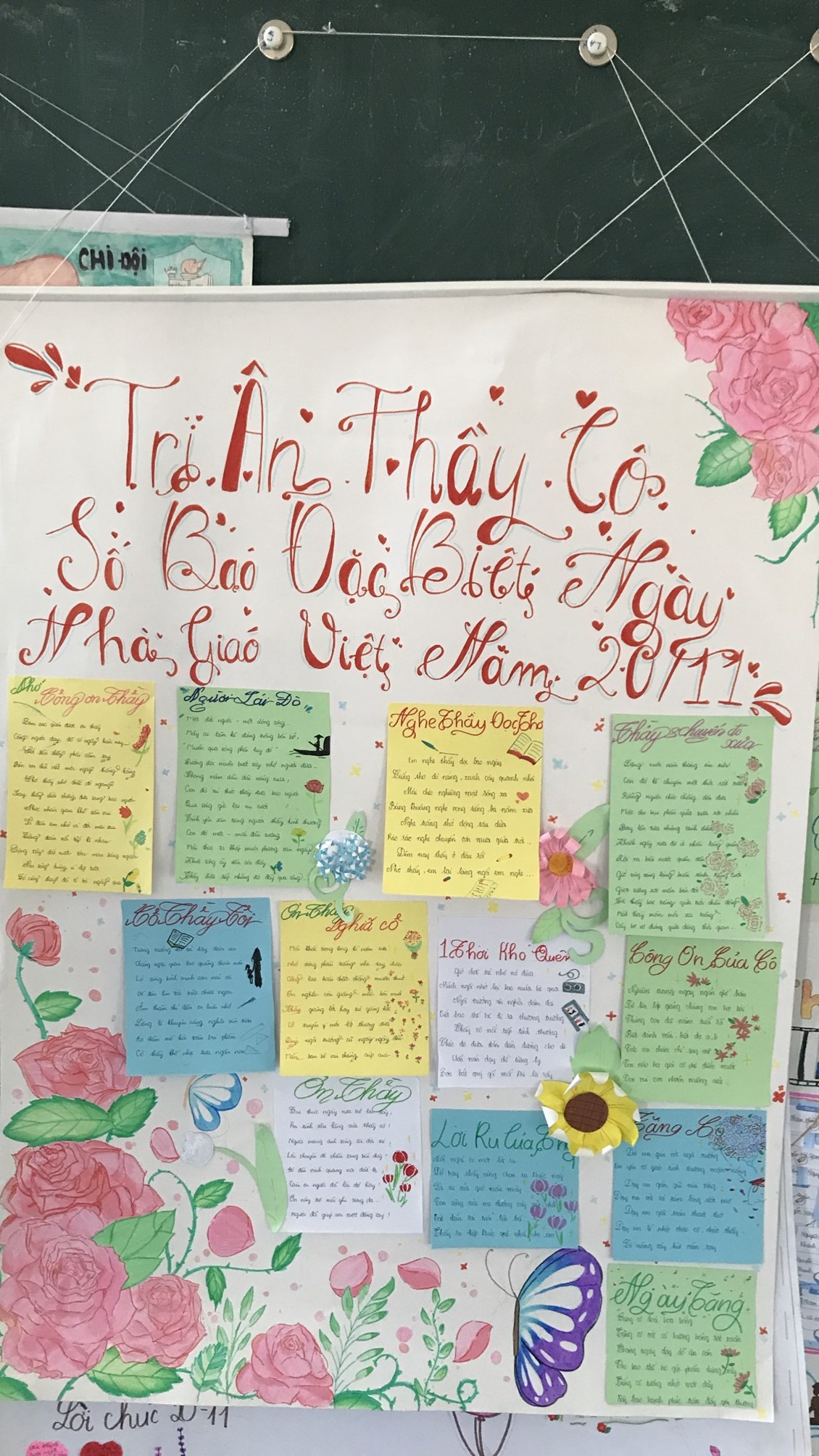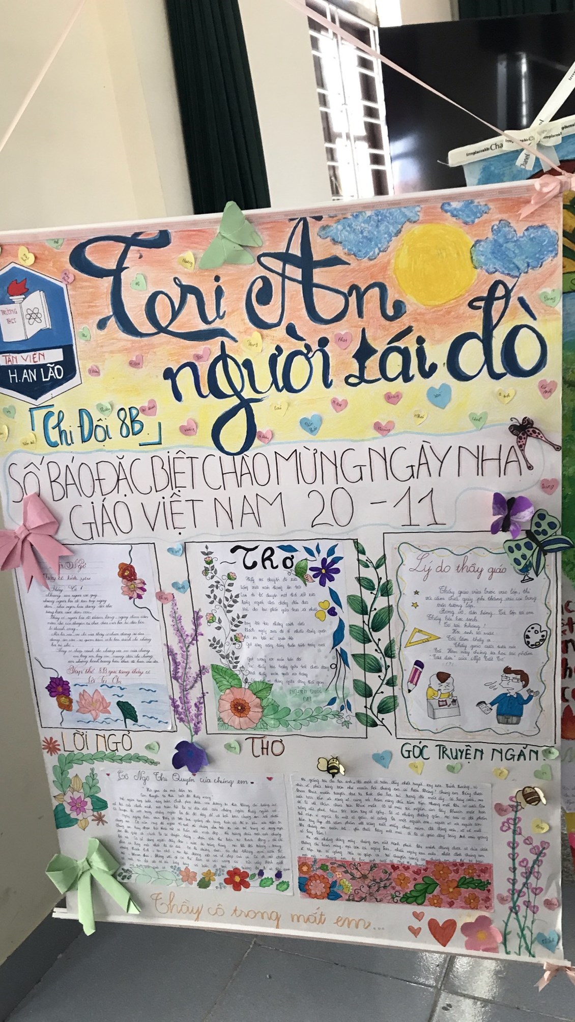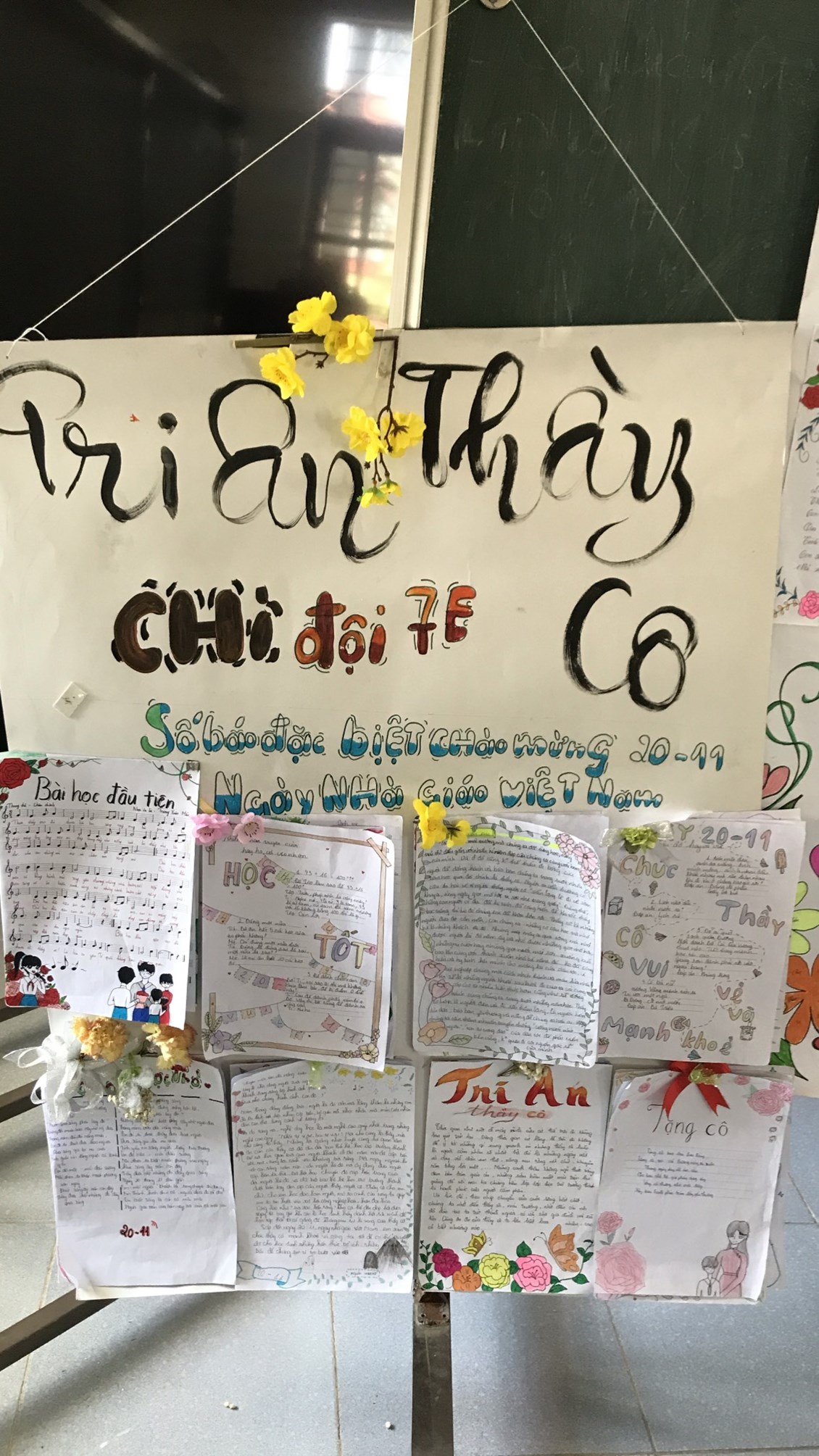2. Tổ chức thi báo tường chủ đề chào mừng ngày Nhà giáo Việt Nam 20/11.Kết quả lớp 9B,8A,7D,6C đạt giải nhất. Lớp 9A,8B,7E,6A đạt giải nhì. Các lớp còn lại đạt giải Ba.