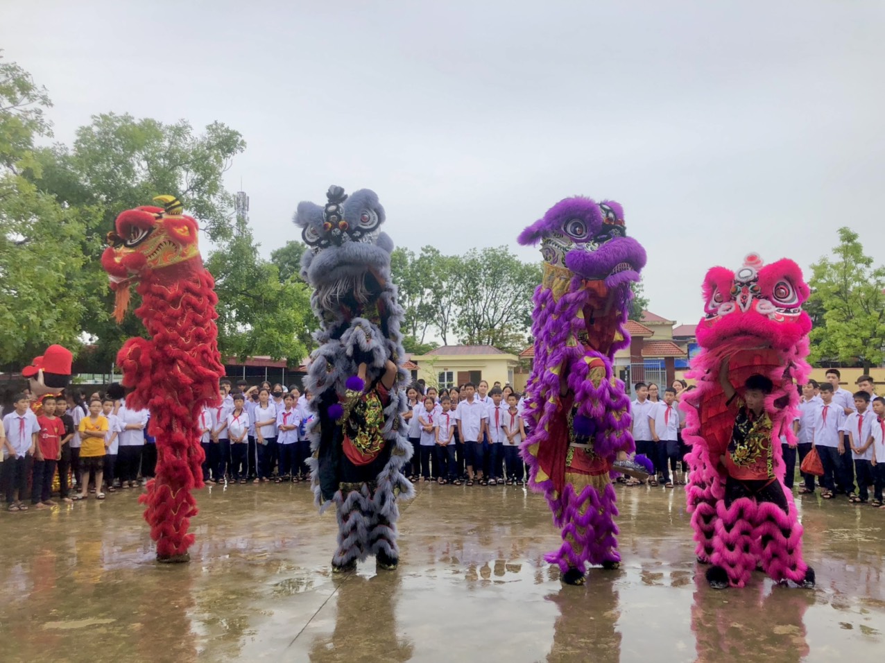 Các em học sinh được xem múa lân, vui phá cỗ Trung thu. Dù thời tiết mưa gió song niềm vui luôn hiện lên trên gương mặt các em.