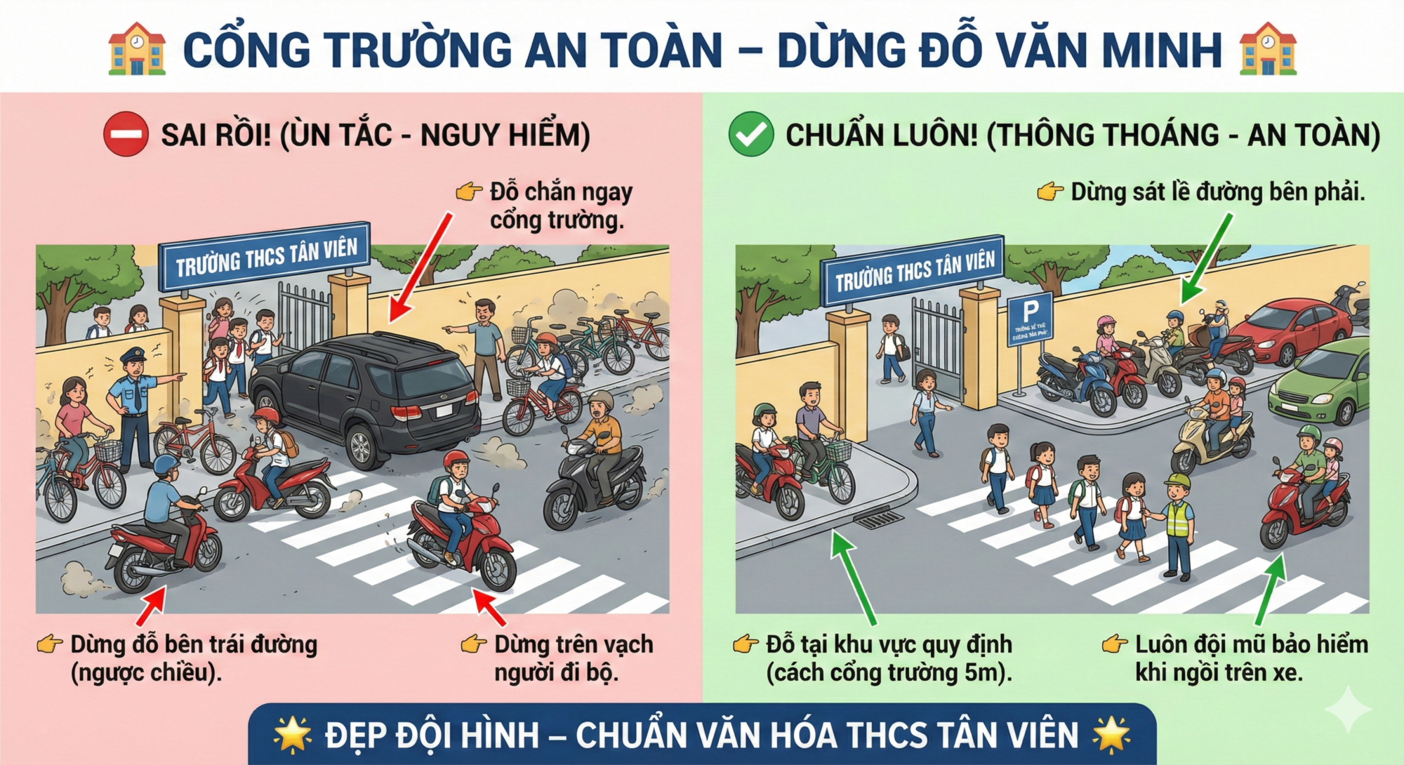 ✅ KHÔNG CHẮN CỔNG: Không dừng, đỗ xe ngay chính diện cổng trường. Hãy đỗ xe cách cổng trường một khoảng cách an toàn hoặc tại các điểm nhà trường/địa phương bố trí.